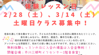 お知らせ 4月開講リトミック無料体験レッスン 西八代郡市川三郷町~中央市 ピアノ・リトミック堀内音楽教室こんにちは。堀内 香です。4月から開講する親子リトミック無料体験レッスンのお知らせです。パパやママと一緒に参加していただくことで子供達は安心できる環境で生の音や自分以外のお友達、身体... 2026.01.24 お知らせリトミック